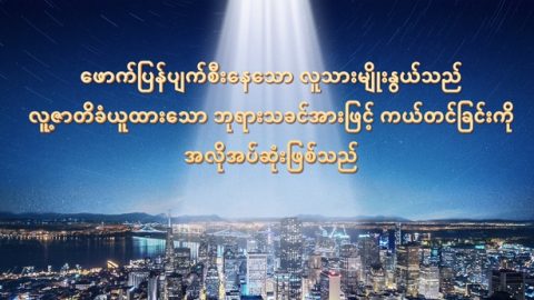 ငါ၏နောက်ဆုံးအလုပ်သည် လူသားကို အပြစ်ပေးရန်အတွက်သာ မဟုတ်ဘဲ၊ လူသား၏ ပန်းတိုင်ကို စီစဉ်ရန် အတွက်လည်းဖြစ်၏။ ထိုထက်မက ယင်းသည် ငါ၏ ပြုမူလုပ်ဆောင်ချက်များကို လူအားလုံး အသိအမှတ်ပြုရန်အလို့ငှာ ဖြစ်သည်။ ငါပြုလုပ်ခဲ့သည့် အမှုအရာအားလုံးသည် မှန်ကန်ကြောင်းနှင့် ငါပြုလုပ်ခဲ့သည့် အမှုအရာ အားလုံးသည် ငါ၏ စိတ်သဘောထားကို ဖော်ပြခြင်းဖြစ်ကြောင်း လူခပ်သိမ်းတို့အား ငါသိစေလို၏။ လူသားမျိုးနွယ်ကို မွေးဖွားခဲ့သည့်အရာသည် လူသား၏လုပ်ဆောင်ချက် မဟုတ်၊ သဘာဝကြောင့် သာ၍ပင်မဟုတ်ဘဲ ဖန်ဆင်းခြင်းတွင် သက်ရှိအရာတိုင်းကို အာဟာရပေးသည်မှာ ငါ ဖြစ်သည်။ ငါမရှိလျှင် လူသားမျိုးနွယ်သည် ပျက်စီးခြင်းသို့သာ ရောက်ပြီး ကပ်ဘေးများစွာ၏ဒုက္ခကို ခံစားရလိမ့်မည်။ လှပသည့်နေနှင့်လ သို့မဟုတ် စိမ်းလန်းစိုပြေသည့် ကမ္ဘာမြေကို မည်သည့်လူသားမျှ နောက်ထပ် မြင်တွေ့ရလိမ့်မည် မဟုတ်ပေ။ လူသားမျိုးနွယ်သည် အလွန်အေးစက်သော ညများနှင့် ရှောင်လွှဲမရသည့် သေမင်း၏အရိပ်လွှမ်းမိုးသော ချိုင့်ဝှမ်းနှင့်သာ ကြုံတွေ့ရလိမ့်မည်။ ငါသာလျှင် လူသားမျိုးနွယ်၏ တစ်ခုတည်းသော ကယ်တင်ရာဖြစ်၏။ ငါသာလျှင် လူသားမျိုးနွယ်၏ တစ်ခုတည်းသော မျှော်လင့်ရာ ဖြစ်သည်သာမက၊ ငါသည် လူသားမျိုးနွယ်တစ်ရပ်လုံး၏ တည်ရှိခြင်းအတွက် တည်မှီရာဖြစ်သည်။ ငါမရှိလျှင် လူသားမျိုးနွယ်သည် ချက်ချင်း လုံးဝဥဿုံရပ်တန့်သွားမည်။ ငါ့ကို မည်သူမျှ အလေးမစိုက်သော်လည်း၊ ငါမရှိလျှင် လူသားမျိုးနွယ်သည် ရုတ်တရက် ဖြစ်ပွားသည့် ကပ်ဘေးဒဏ်ခံရပြီး တစ္ဆေအမျိုးမျိုးတို့၏ ဖဝါးအောက် နင်းချေခြင်းခံရလိမ့်မည်။ အခြားမည်သူမျှ မပြုနိုင်သည့်အမှုကို ငါပြုခဲ့ပြီဖြစ်ပြီး လူသားသည် ငါ့ကို အချို့သော ကောင်းမှုများဖြင့် ကျေးဇူးပြန်ဆပ်ရန်သာ ငါမျှော်လင့်သည်။ ငါ့ကို ကျေးဇူးဆပ်နိုင်သူတို့မှာ အလွန်နည်းပါးသော်လည်း၊ ငါသည် ဤလူ့လောကတွင် ငါ၏ခရီးကို အဆုံးသတ်ပြီး ငါ၏ဖွင့်လှစ်ပြခြင်းအမှု၏ နောက်တစ်ဆင့်ကို စတင်ဦးမည် ဖြစ်သည်၊ အကြောင်းမူကား ဤနှစ်ပေါင်းများစွာ လူသားအကြား ငါ၏ခေါက်တုံ့ခေါက်ပြန် အပူတပြင်း လုပ်ဆောင်မှုသည် အကျိုးဖြစ်ထွန်းပြီးဖြစ်၍ ငါသည် အလွန်ကျေနပ်၏။ ငါအရေးစိုက်သည်မှာ လူအရေအတွက် မဟုတ်ဘဲ၊ သူတို့၏ ကောင်းမှုများသာ ဖြစ်၏။ မည်သို့ပင်ဖြစ်စေကာမူ သင်တို့ကိုယ်တိုင်၏ ပန်းတိုင်အတွက် ကောင်းမှုများအလုံအလောက် သင်တို့ပြင်ဆင်မည်ဟု ငါမျှော်လင့်၏။ ထိုအခါ ငါကျေနပ်လိမ့်မည်။ သို့မဟုတ်ပါက သင်တို့ အပေါ်ကျရောက်လာမည့် ဘေးအန္တရာယ်ကို သင်တို့တစ်ဦးမျှ ရှောင်နိုင်မည် မဟုတ်။ ဤဘေးဒုက္ခသည် ငါ့ထံမှစတင်၍ ငါစီစဉ်ညွှန်ကြားခြင်း ဖြစ်သည်မှာ မှန်ပေသည်။ ငါ၏အမြင်၌ သင်တို့သည် ကောင်းမွန်ပုံ မပ